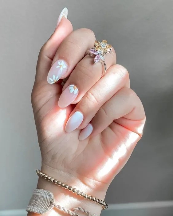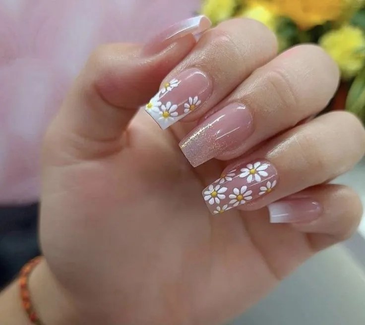 For a simple and sweet look, try painting white daisies on your nails. You can use a dotting tool to create the petals, or you can use a stencil if you’re not as confident in your freehand skills.